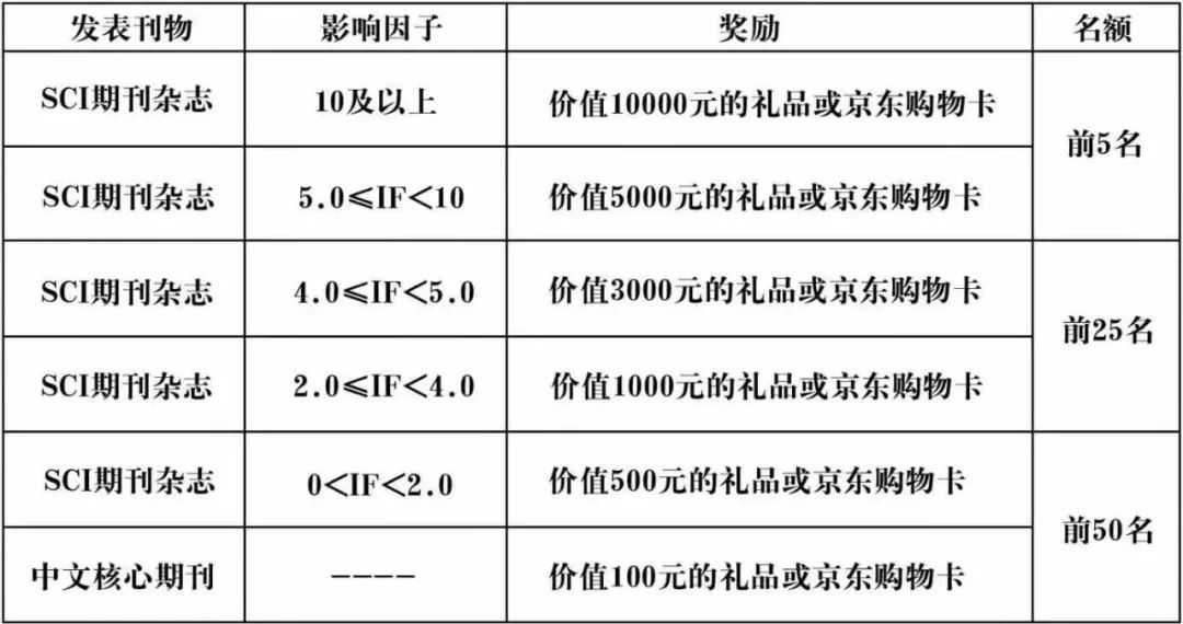 于2018年10月15日至2021年10月14日期間在中文核心期刊雜志或SCI期刊雜志發(fā)表文章,獎勵額度依據(jù)文章發(fā)表時雜志最新的SCI影響因子,具體獎勵如下: